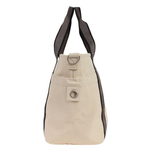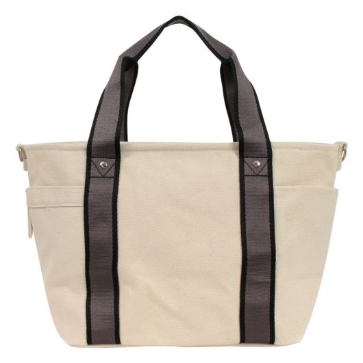 配色のテープハンドルが目を引くキャンパスバック。安定感のあるデザインと収納力を兼ね備えています。普段使いはもちろん、お買い物バックとしてもお勧めです。
