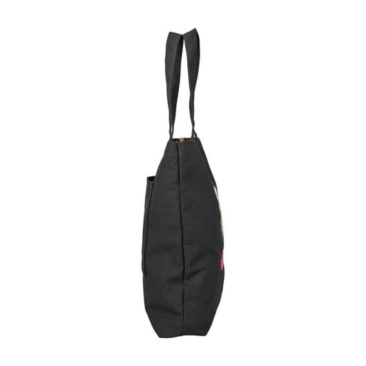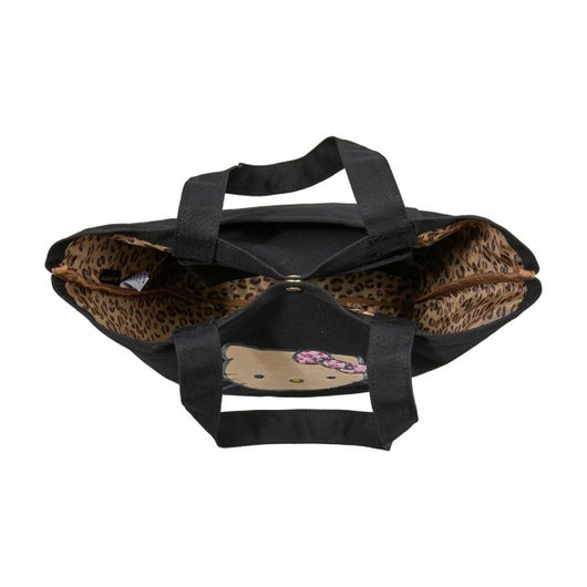 日焼けデザインのハローキティのトートバッグ。日焼けデザインのハローキティがピンクのヒョウ柄リボンをつけたお顔の刺繍がかわいい。トートバッグのブラックの生地に映えるピンクのロゴも大人かわいいデザインです。内装はヒョウ柄でかわいいが詰まったトートバッグです。