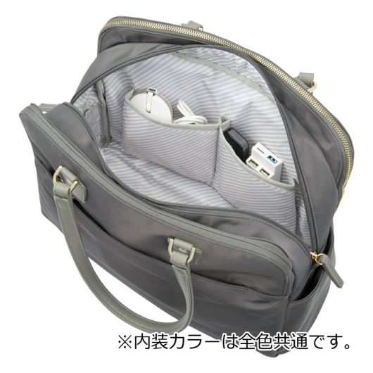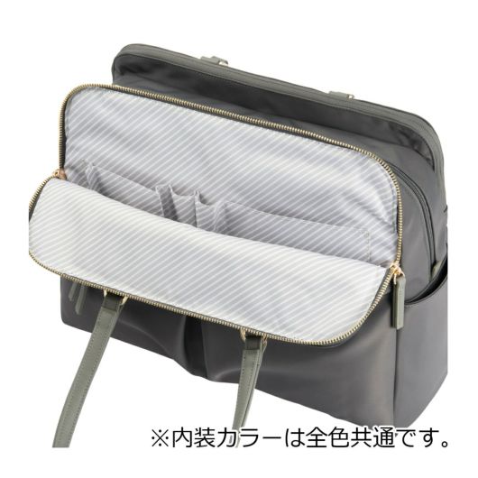 ノートPCの持ち運びに最適な、優秀お仕事バッグシリーズ 「ラポルテム」テレワークと出社を組み合わせたハイブリットワークに最適なトートバッグです。スーツスタイルやオフィスカジュアルスタイルに最適なきれいめなデザイン。整理整頓しやすい3気室に分かれたおつくりです。13.3インチのノートPC、A4ファイルが入るサイズ感。モバイル周辺機器やファイル類、ポーチ、お弁当箱など女性の通勤に必要なアイテムをしっかり収納可能です。