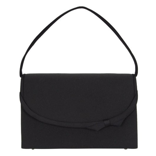フラップの縁部分に控えめなリボンを施した上品なブラックフォーマルバッグで、マット感あるポリエステル素材が高級感を演出しております。付属品として手提げ、袱紗がついております。