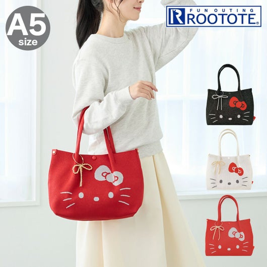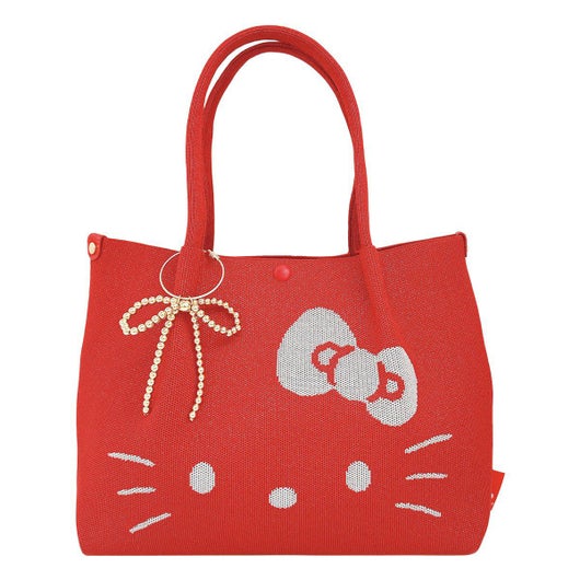 ラメ入りの糸で編まれた本体に、愛らしいハローキティのデザインが気分を高めてくれます。サラリとした手触りでニットなのにハリがあり、自立するのも魅力です。取り外し可能なリボン型チャーム付き。きらめくラメとリボン、ホリデーシーズンにもぴったり!