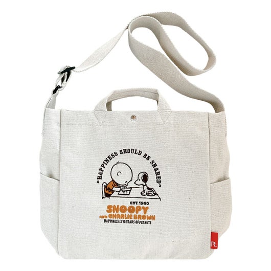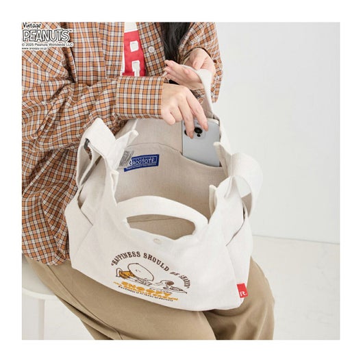 13.5oz相当の厚手リサイクルコットンを使用。ざっくりと風合いのある生地にスヌーピーの刺繍を施しました。A4書類やノートPCも余裕で収納できる2WAYタイプ。