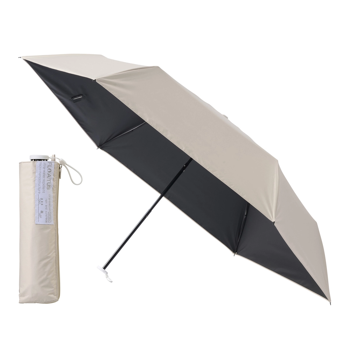 軽量ボディに加え、生地表面にナノレベルの微細加工を施すことで、水滴が一振りで落ちる超撥水性能を実現したオールインワンモデルです。雨の日に折りたたんでバッグへしまう際、水滴が荷物に付くのが気になる方も多いと思いますが、フロータスならその心配がほとんどありません。遮光100%・UVカット100%・耐風構造も搭載されており、天候を問わず一本で対応できる安心感があります。