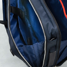 日常にもビジネスにも使えて、1 泊程度なら出張にも対応できる収納力抜群のビジネスリュック。メインの荷室はキャリーケースのように大きく2 層に分かれ、仕事道具と着替えを切り離して収納可能。上部には、スマホやパスケースを座って抱えたまま出し入れしやすい浅めのポケットを設けた。