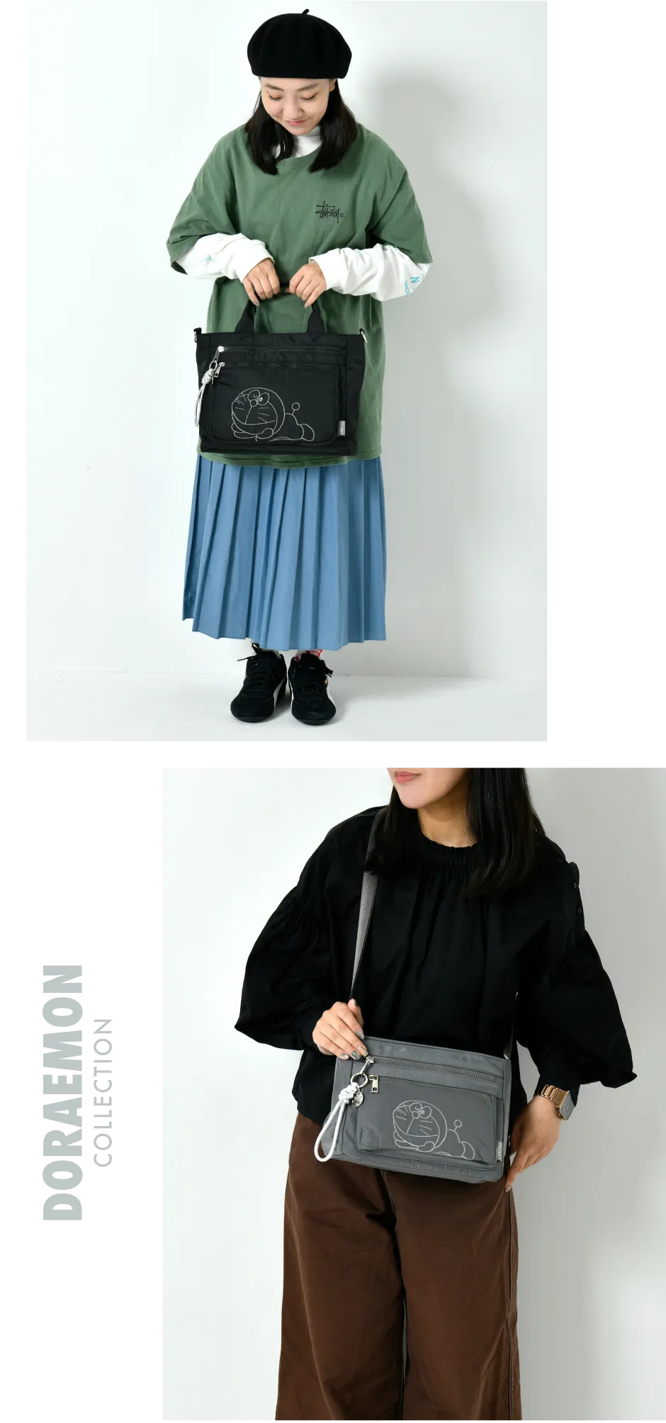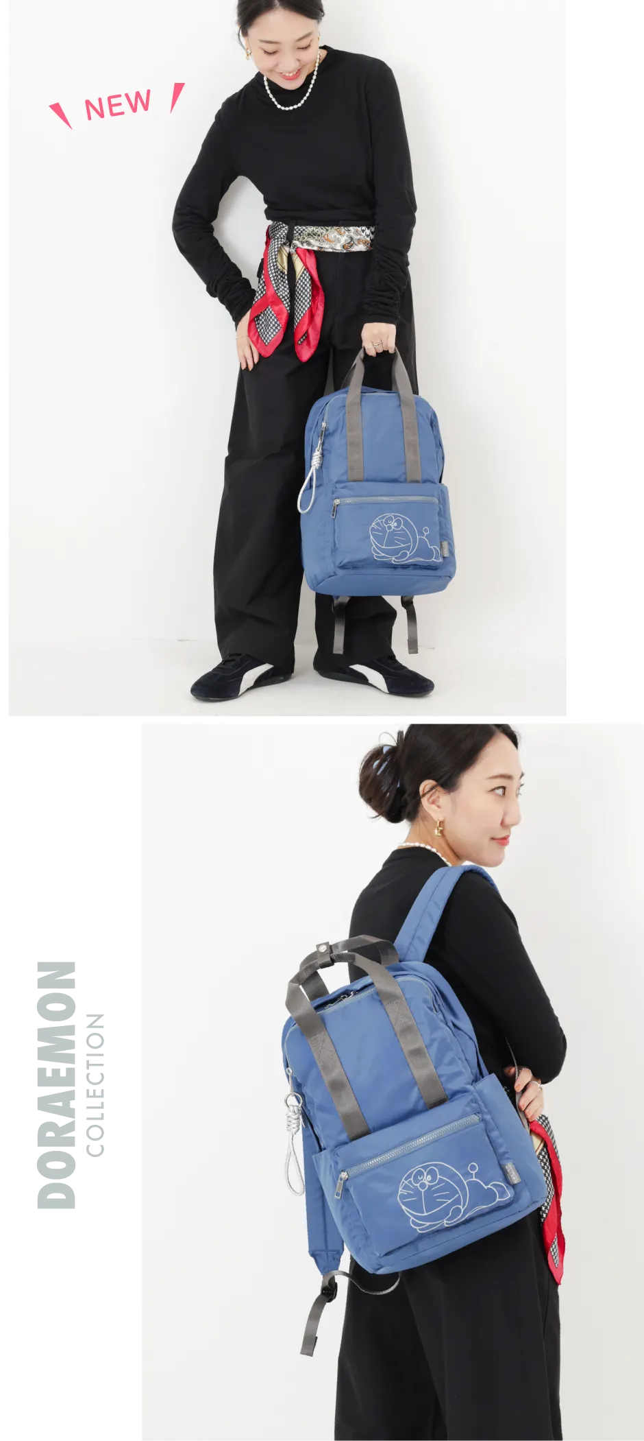 シンプルで使いやすいデザインに、寝そべったドラえもんの刺繍がさりげないアクセント!今回新たにリュックが加わり、シーンに合わせて選べるラインナップになりました。バッグには、キラリとポイントになるシルバーのドラえもんチャームが付属!バッグのカラーコーディネートに合わせやすいベーシックな4色展開です♪