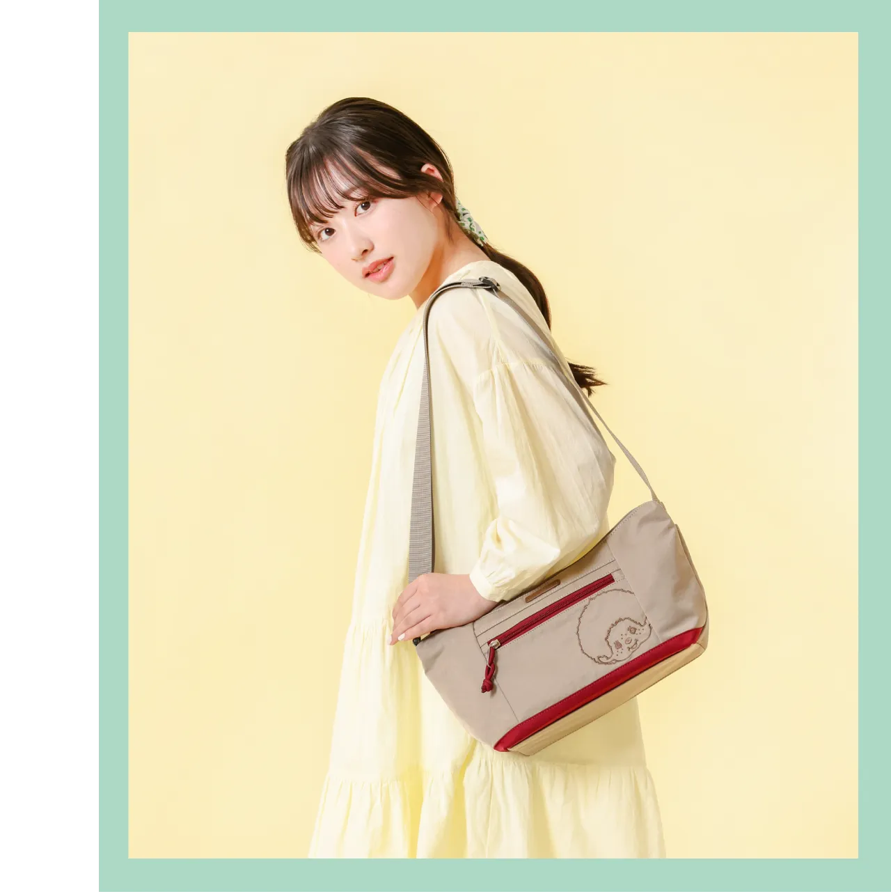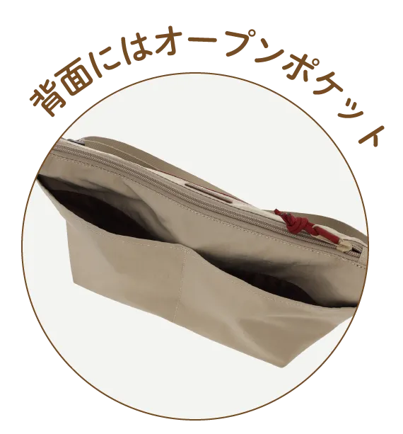 舟形ショルダーは開閉部分が広いので、出し入れしやすく使い勝手バツグン!机や椅子の上に置いた時なども自立するので、何かと便利。ベージュはボルドーとのバイカラーで、コーデに馴染みやすい落ち着いた配色。