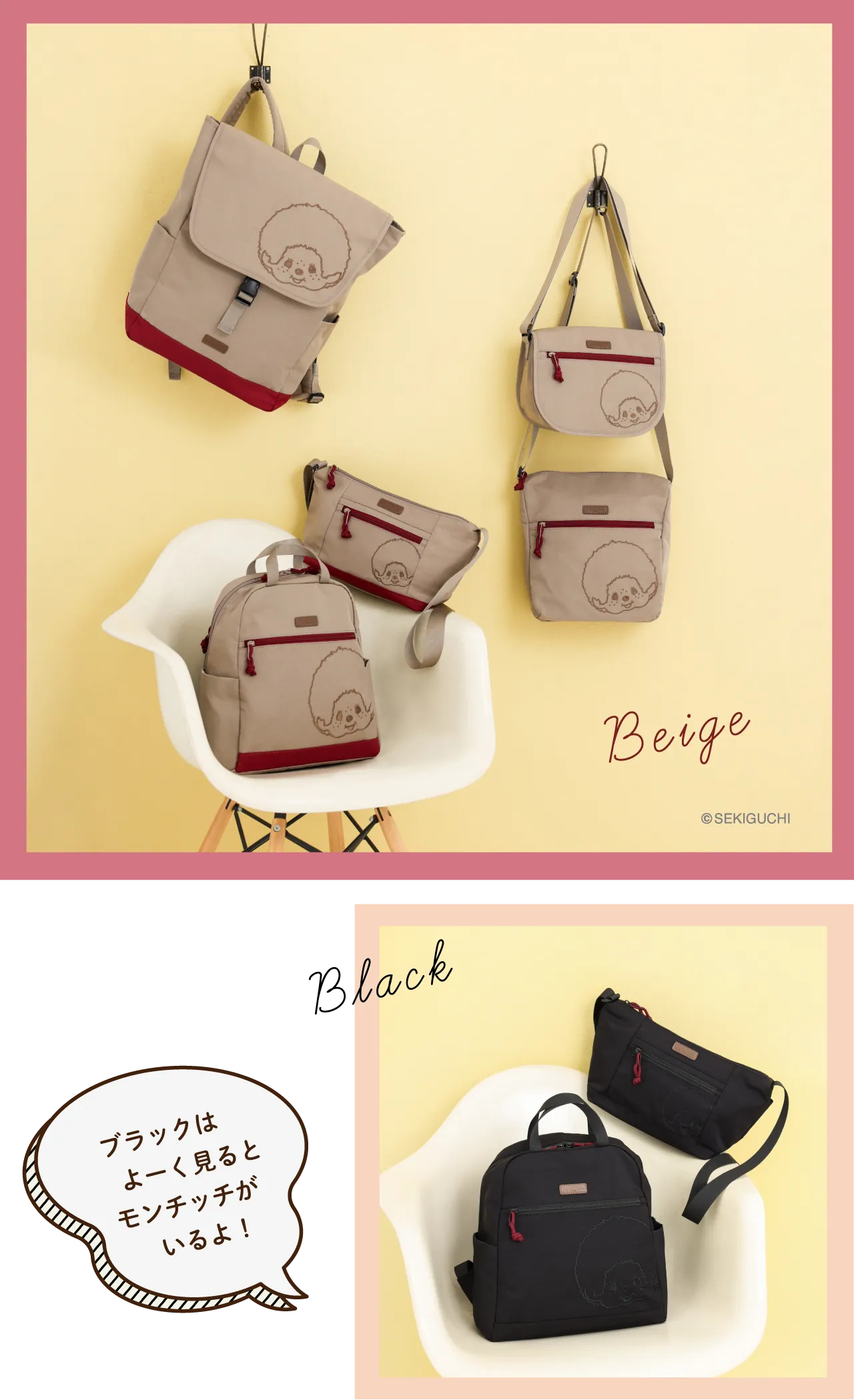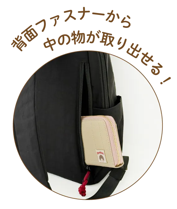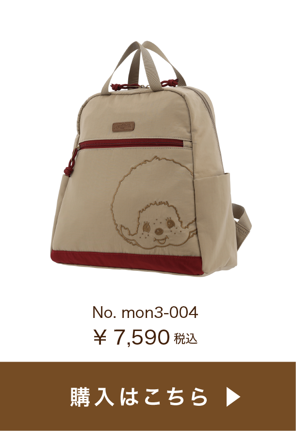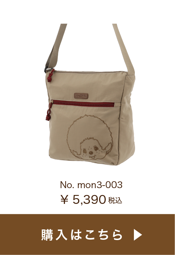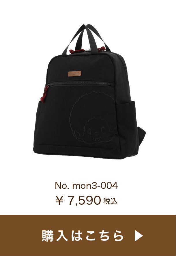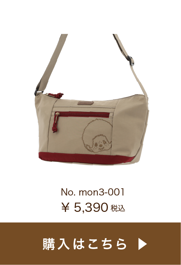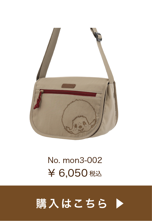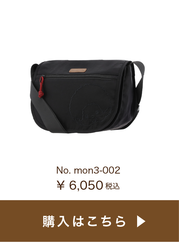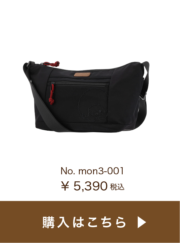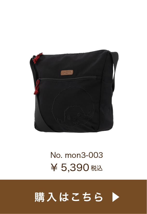コロンとした丸みが可愛く、コンパクトで普段使いに丁度いいサイズ感。ファスナー開閉もスムーズ♪ブラックは同色の糸で刺繍がされているのがポイント。目立ちすぎないモンチッチが渋カワイイ✨ファスナーに付いている引き手のロープのボルドーカラーがアクセントに。